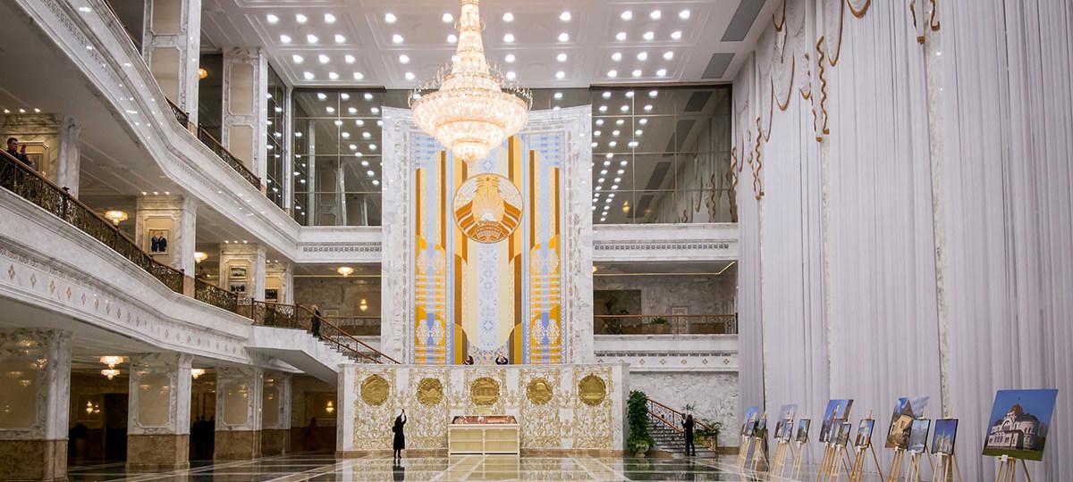 В Телеграм-канале «Пул Первого» появилось фото, на котором мужчина в спецодежде меняет лампочки на гигантской люстре во Дворце Независимости в Минске. При этом сама люстра приспущена практически до пола, а человек находится в люльке, на голове у него каска.