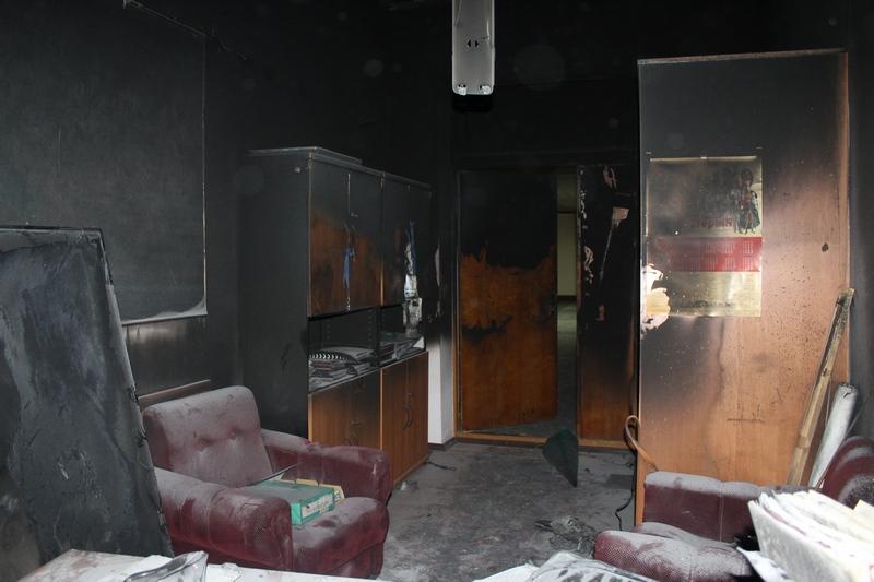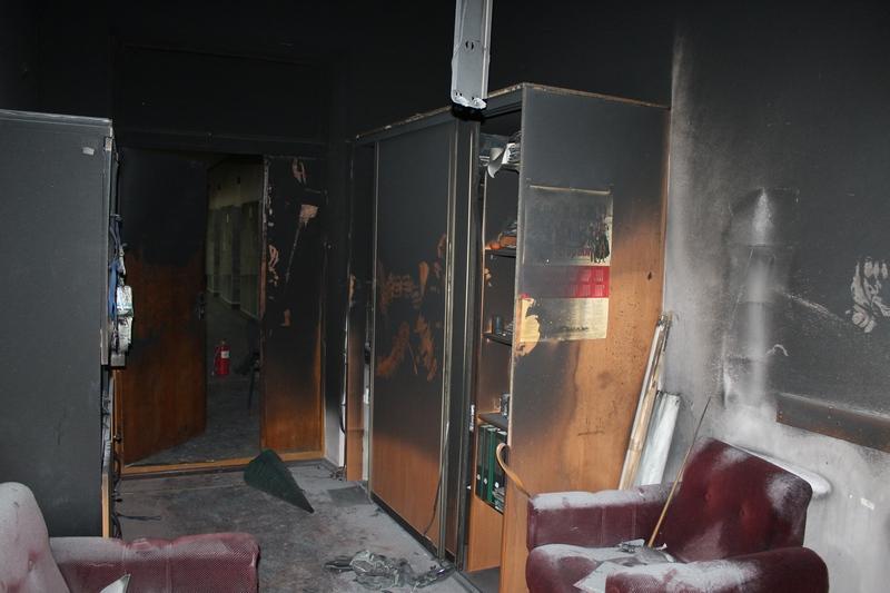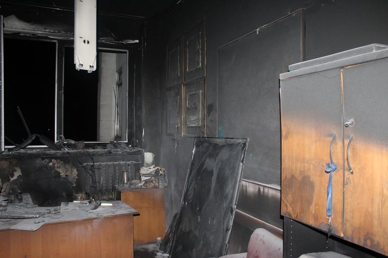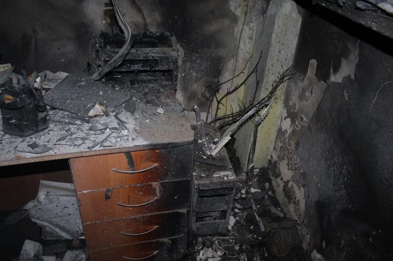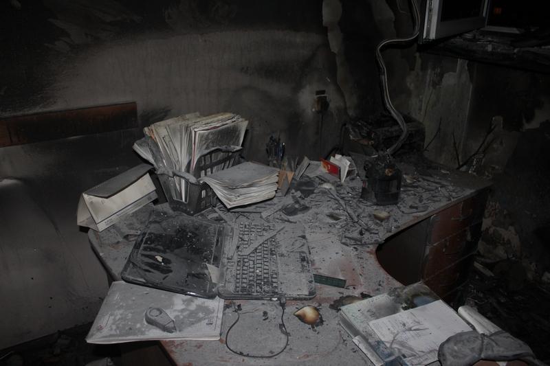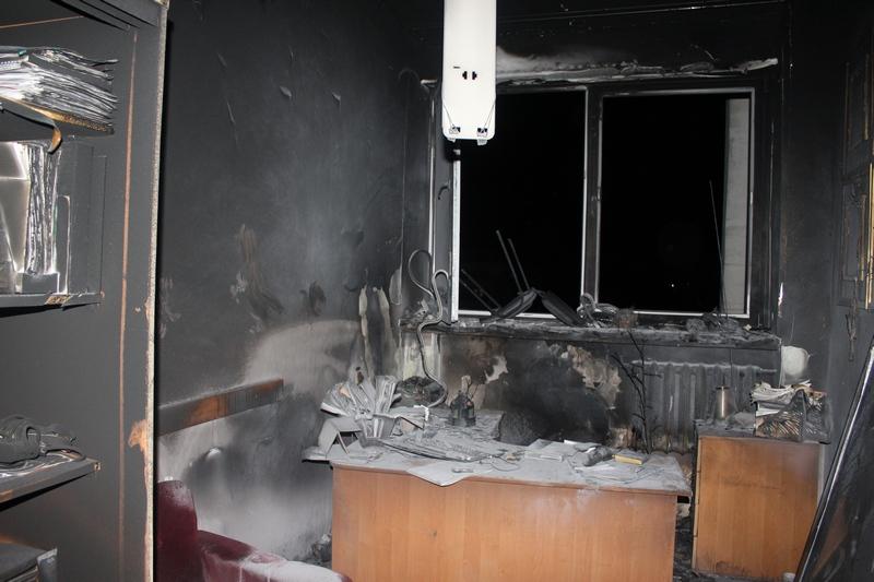Огонь уничтожил системный блок компьютера и принтер. Повреждены письменный стол и окно, закопчены стены и потолок в кабинете на последнем седьмом этаже здания.
