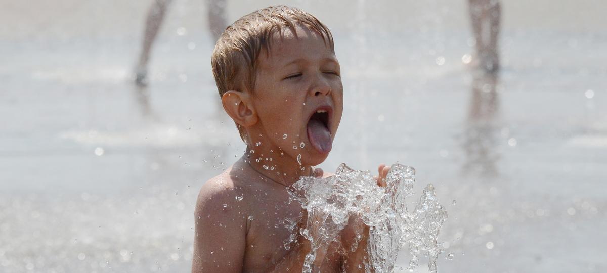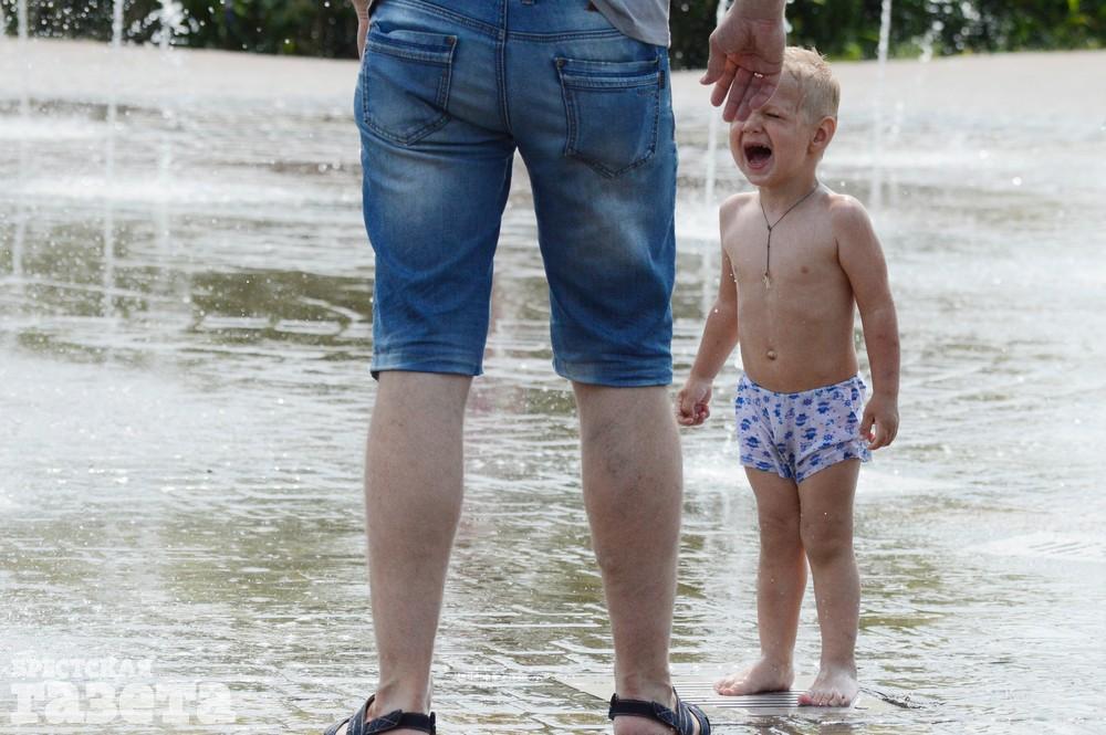 Многие резвятся в фонтане на набережной: кто в одежде, кто в купальниках и плавках, а самые маленькие — и голышом.