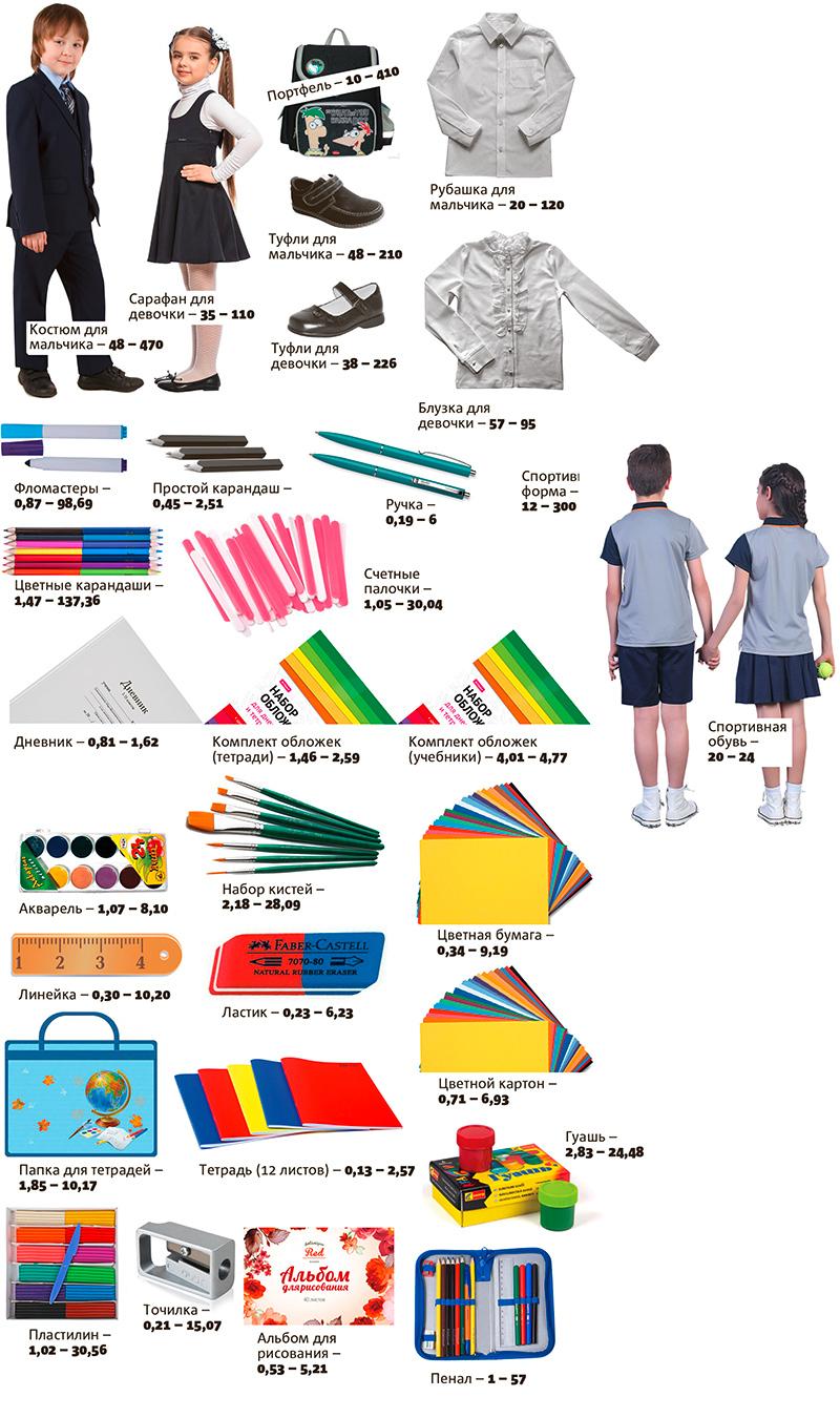 В этом году, по подсчетам «БГ», собрать в первый класс мальчика можно будет на сумму от 182 до 2 274 белорусских рублей, девочку — от 196 до 1 905 рублей.