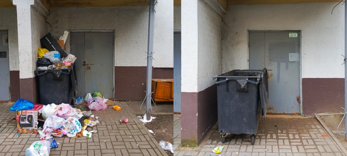 Паводле яе слоў, дастаткова прайсці літаральна некалькі дзясяткаў метраў, каб выкінуць смецце ў прызначаным месцы, але некаторыя гэтага не робяць. У якасці прыкладу яна апублікавала фота двух суседніх пад’ездаў: каля аднаго — горы пакетаў і адходаў, каля другога — адносны парадак.